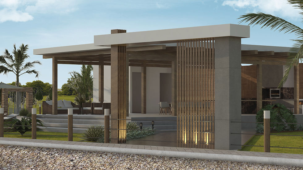 Projeto arquitetônico para uma fazenda, com criação de pórtico de entrada, estacionamento, área gourmet e quiosques, além de reforma na sede.