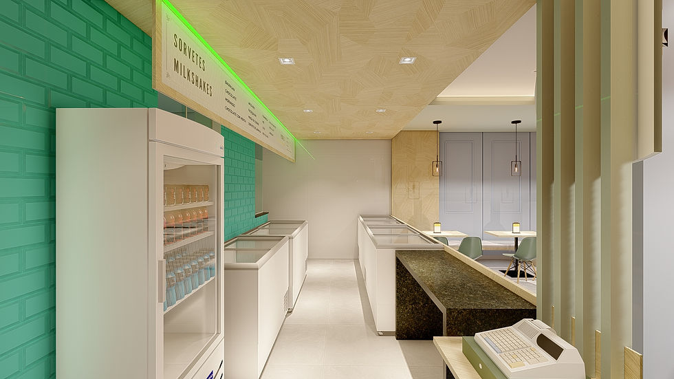 Projeto arquitetônico de reforma e interiores para fábrica de sorvetes e sorveteria, a tradicional Ping Mel.